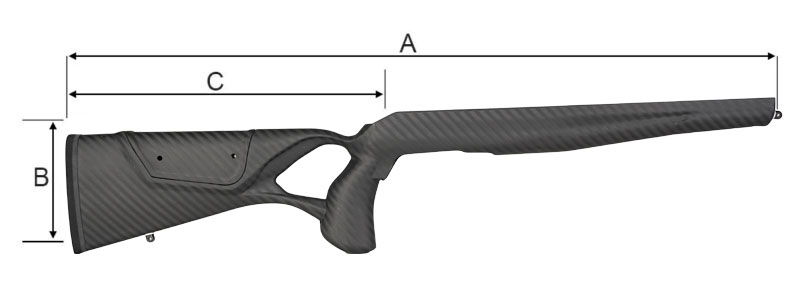 | Dimensions (mm) | – longueur totale (A) 737,99 – hauteur (B) 126,16 – longueur de la crosse (C) 303,27 (tolérance : +/- 1%) |